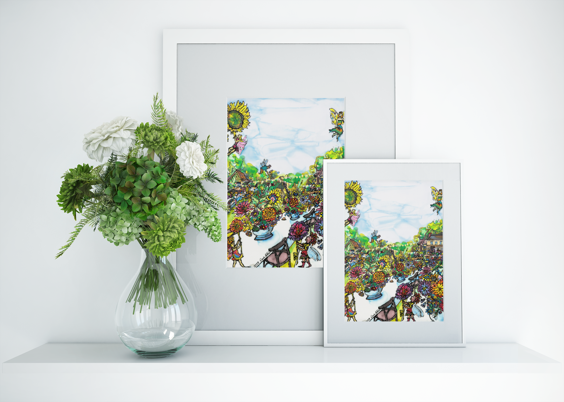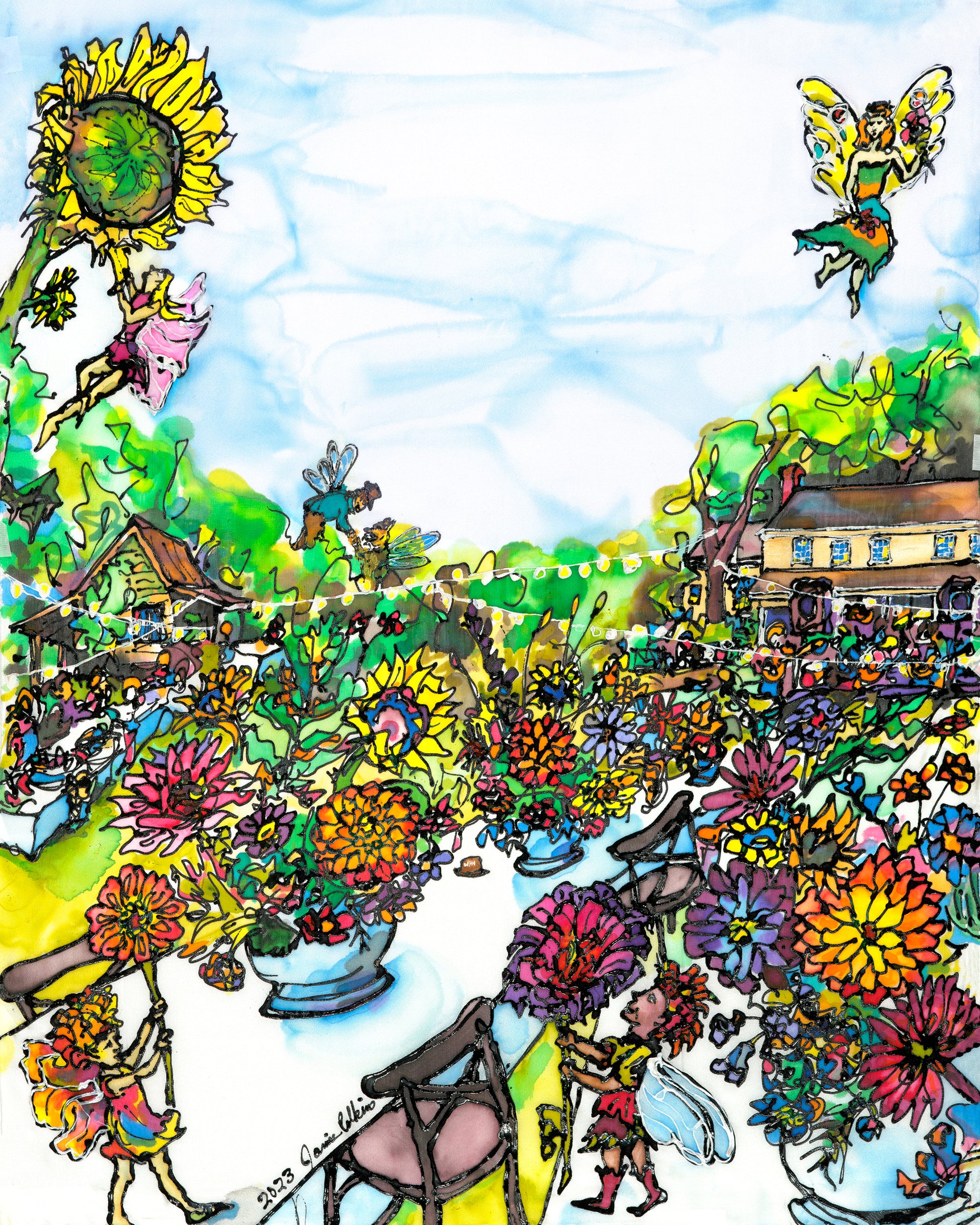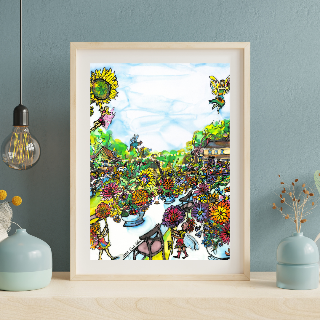 ~Harvest Fest is a whimsical print full of flowers, fairies and my signature sunflowers.