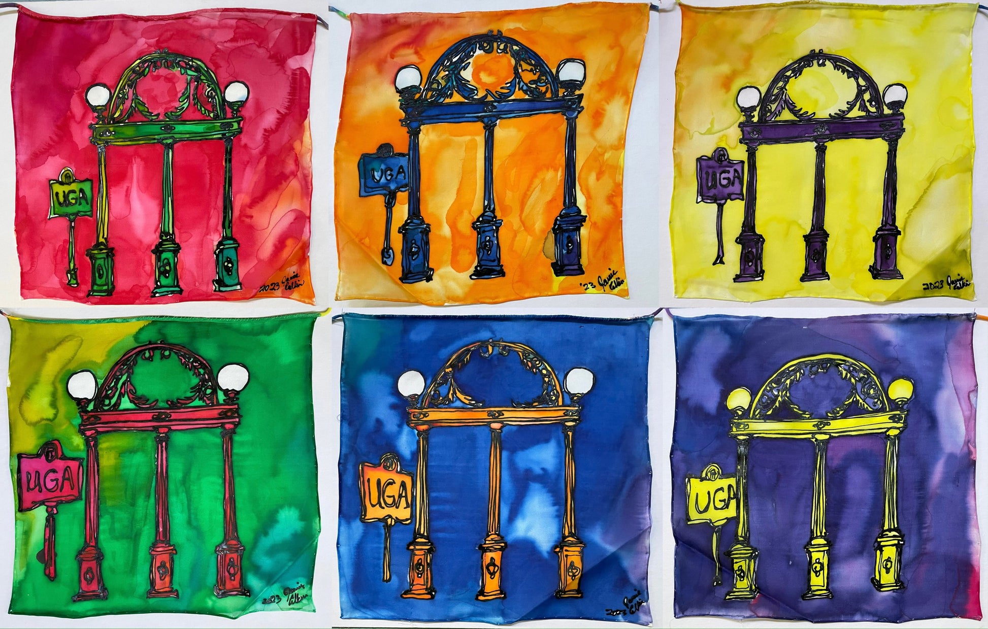 This is a 10 ft long banner made of six 12x12in paintings on silk. Although it is not pictured, these silks are strung together, one after another in one long string.