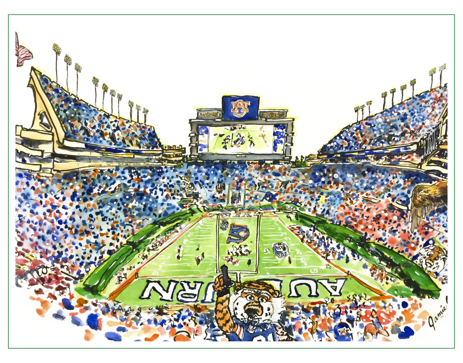 A giclee print of an original ink and watercolor painting of Auburn University’s Jordan-Hare Stadium.