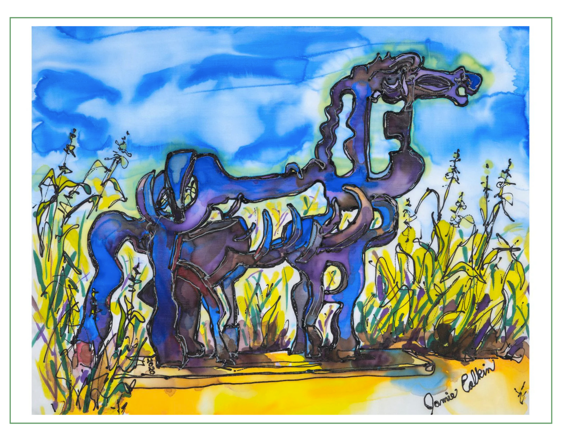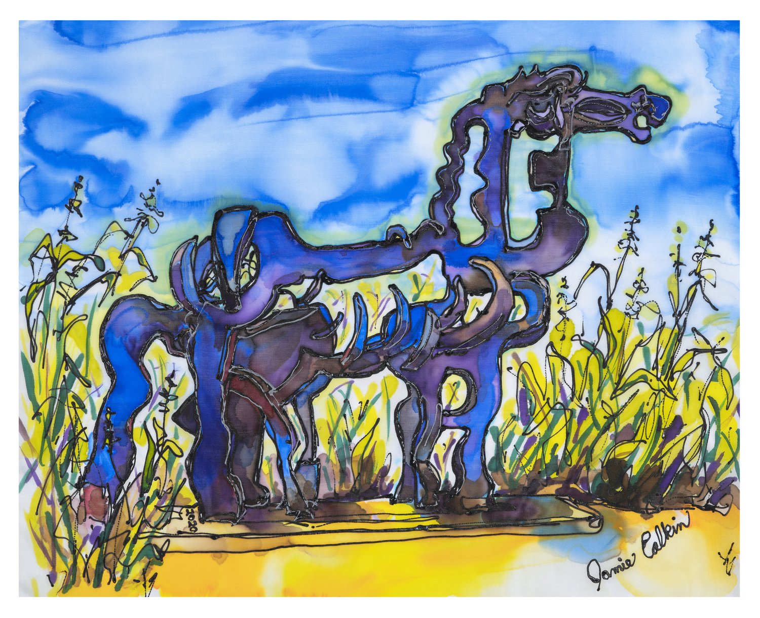 A giclee print of an ink and watercolor painting on silk of the Iron Horse statue in Athens, GA.