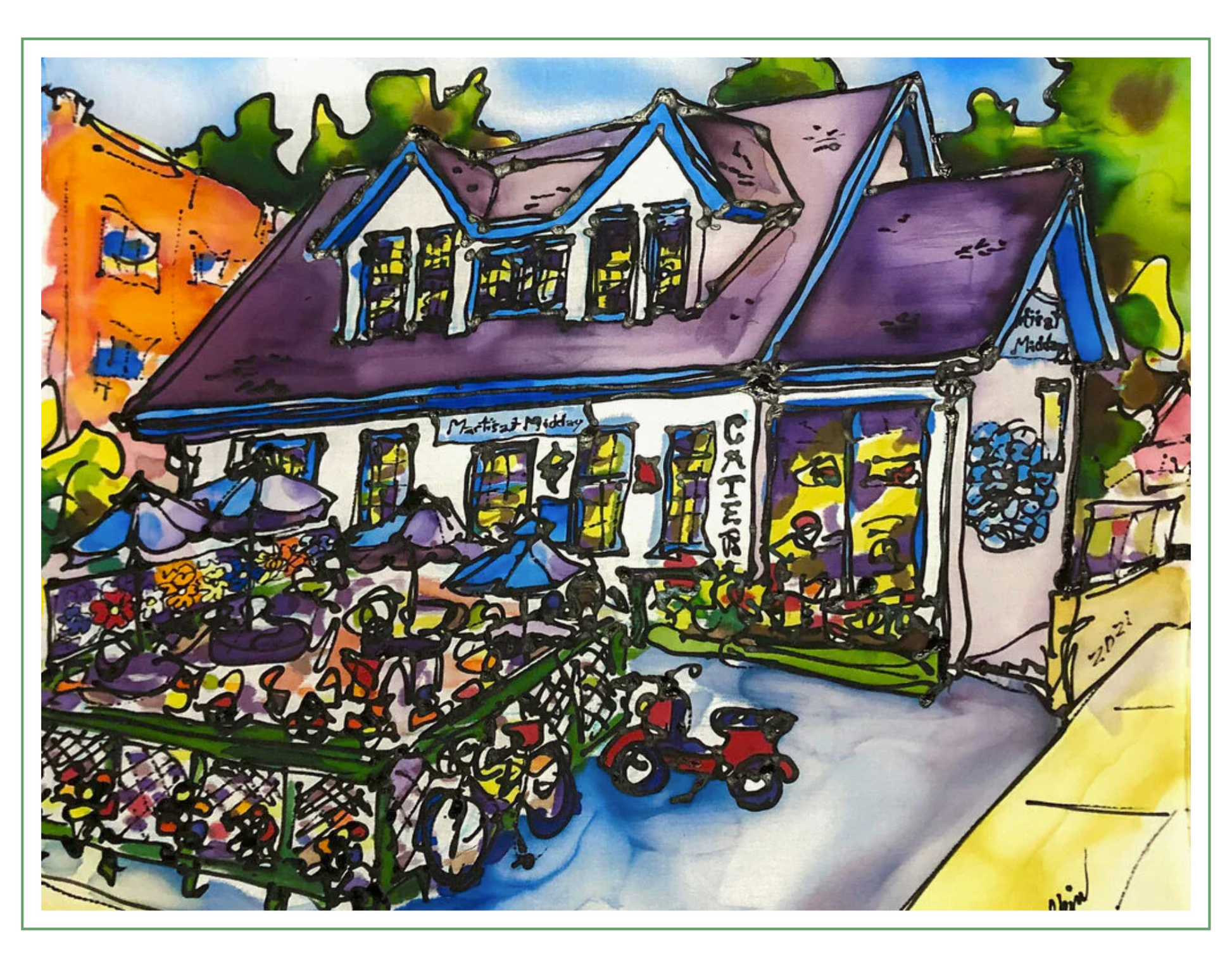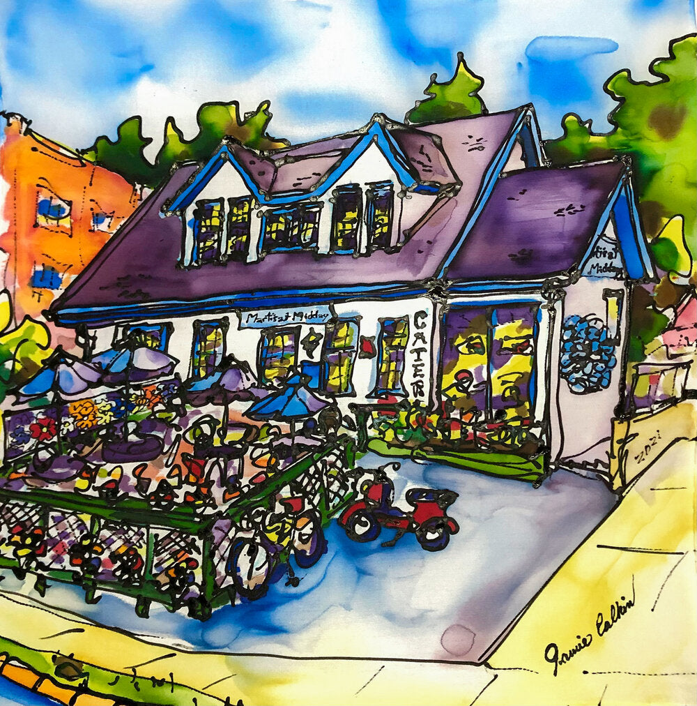 ~A giclee print of an original ink and watercolor painting completed on 100% silk.