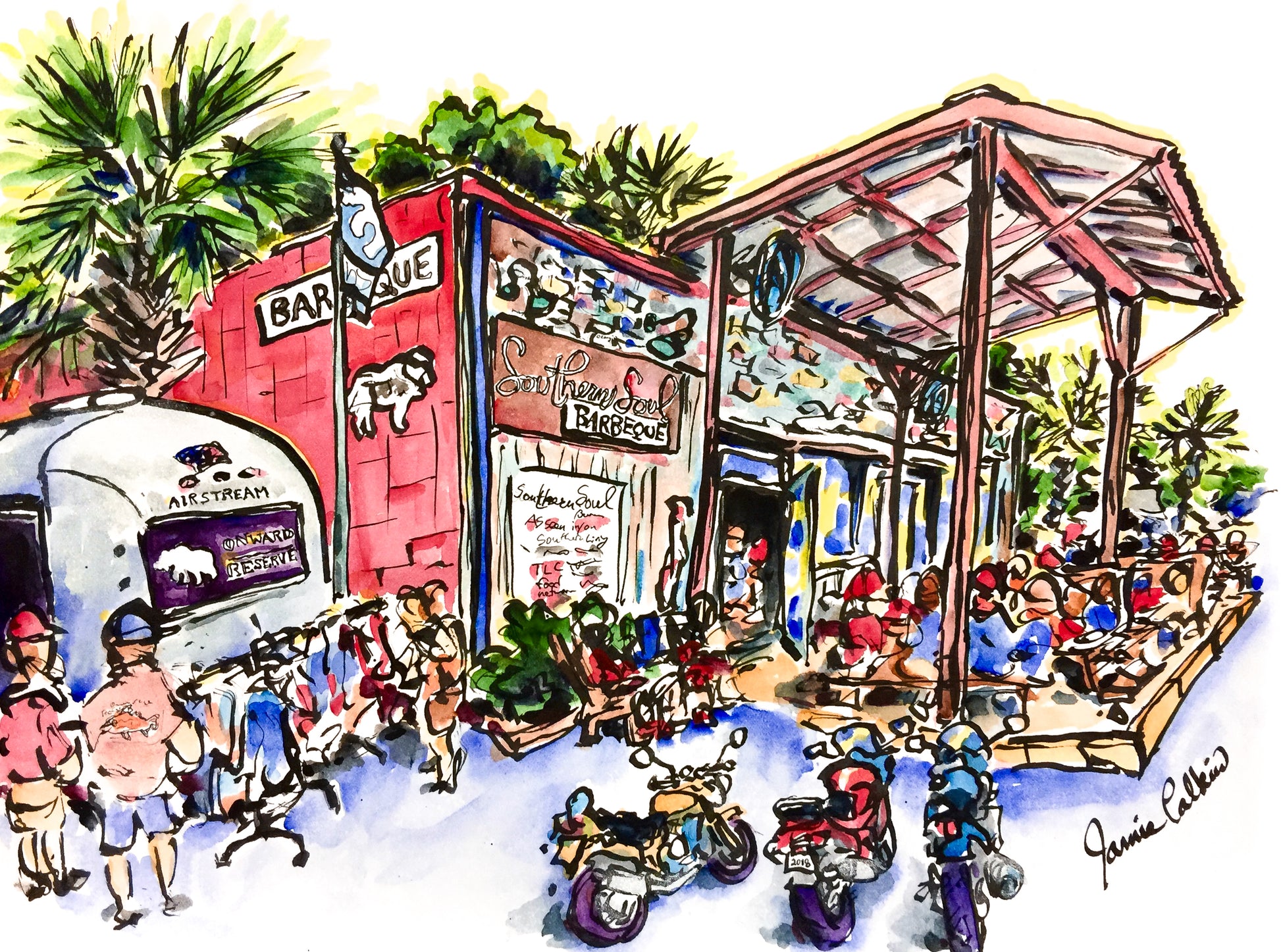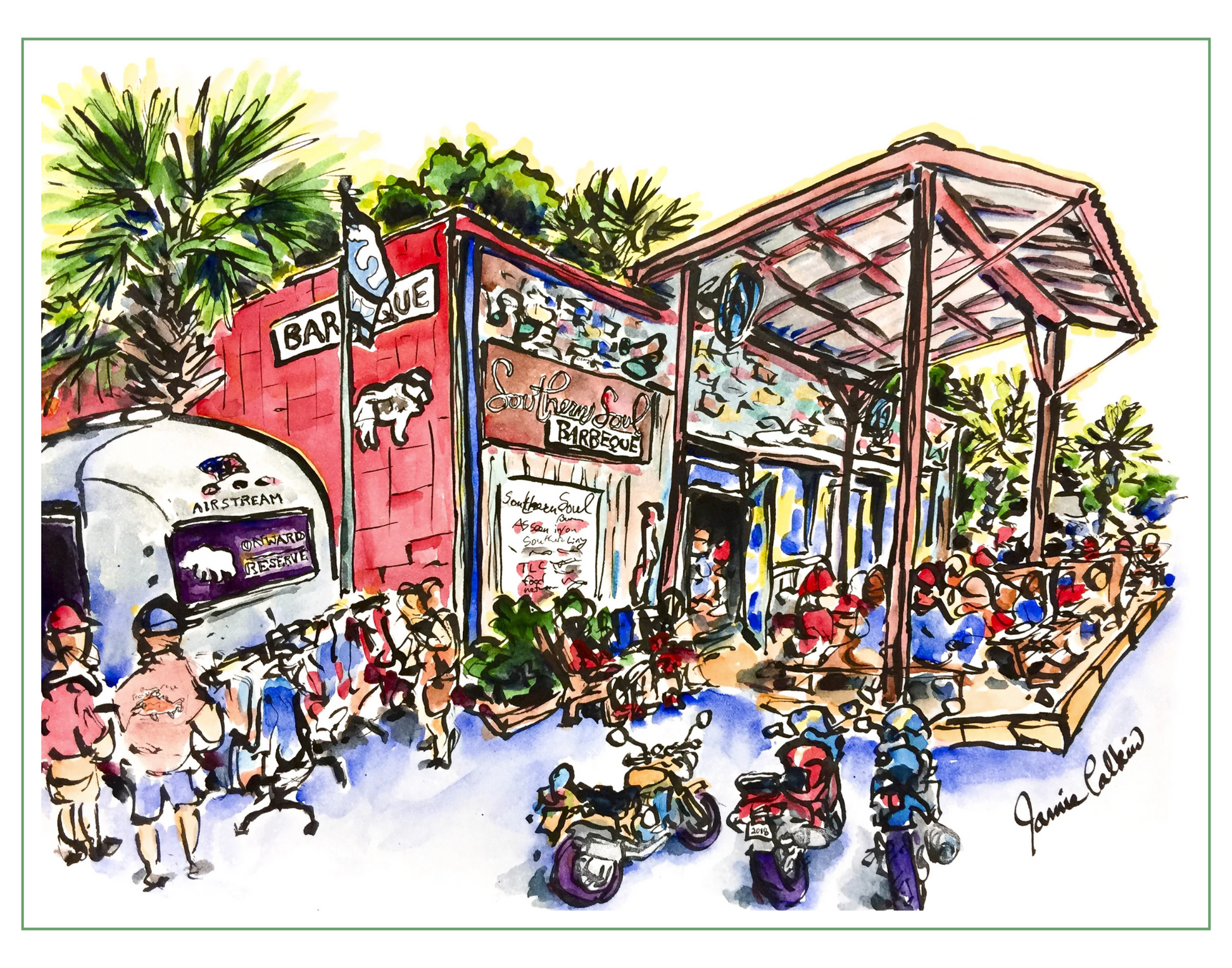 A print from an original painting of Southern Soul BBQ in St. Simons, GA with Onward Reserve.