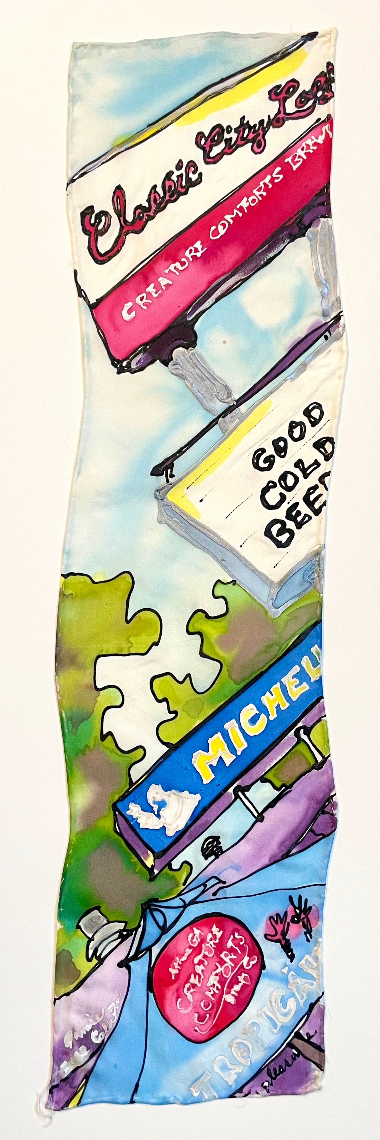 A bold and colorful 6' x 24' hand-painted silk capturing the lively Creature Comforts signage from the Wednesday Farmers Market.