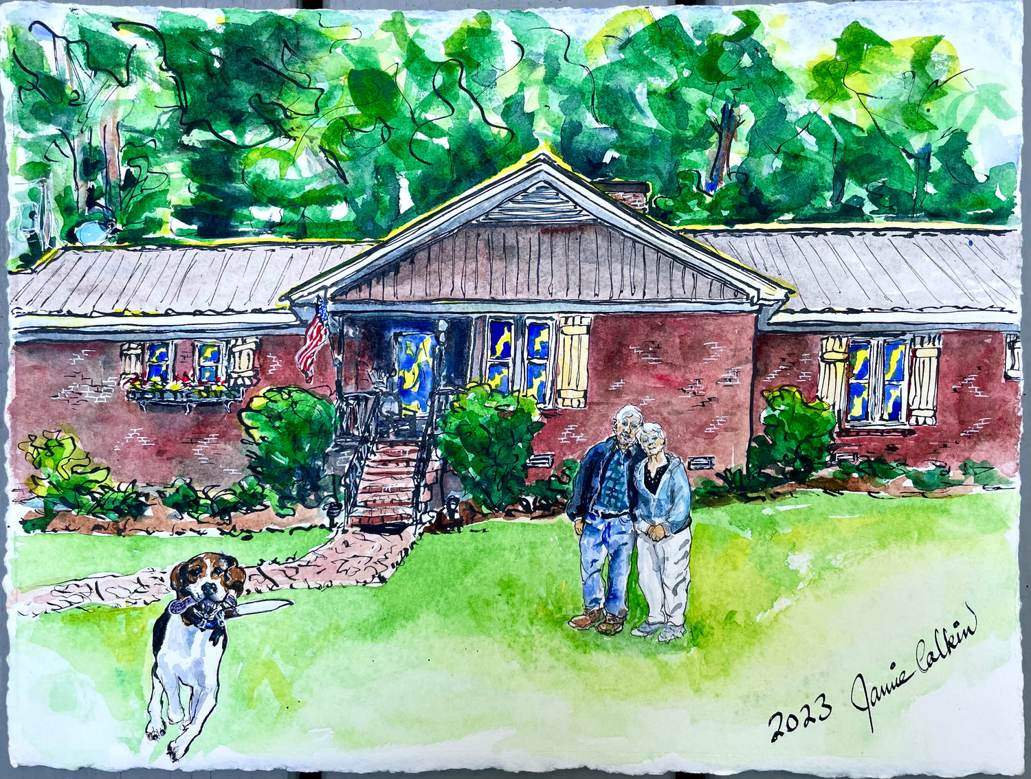 This was a gift from a daughter to her parents. It captures the love shared by the parents, the beautiful home, and the playful pooch!