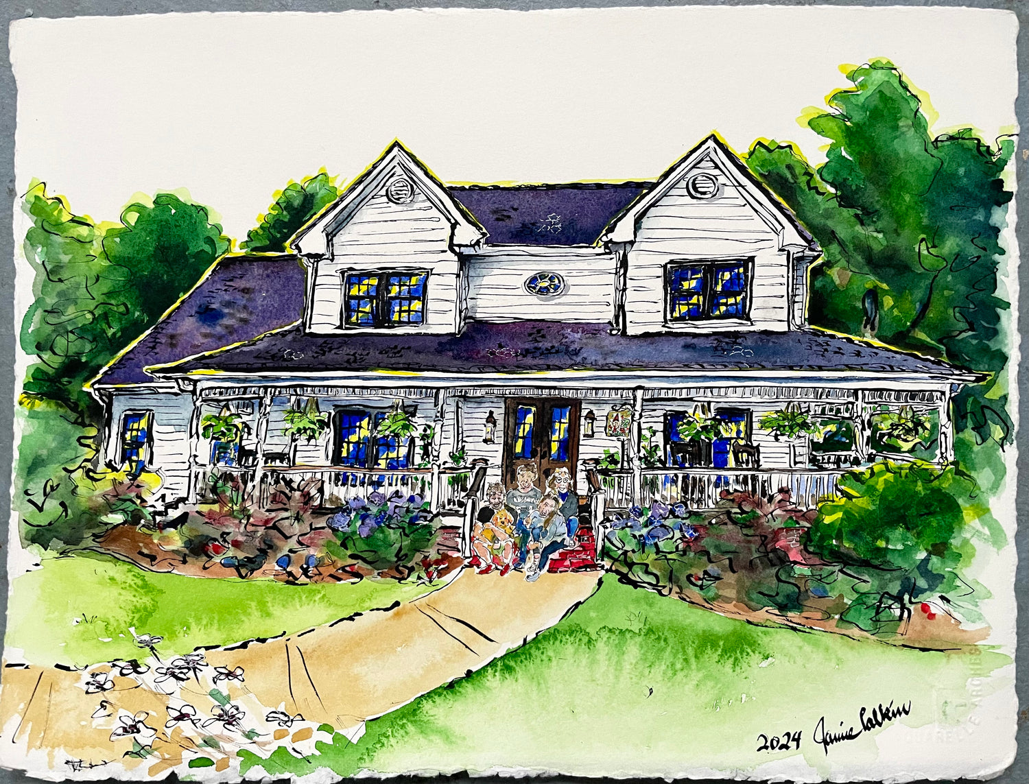 This painting was commissioned by the mom to capture their family home with everyone hanging out on the front porch.